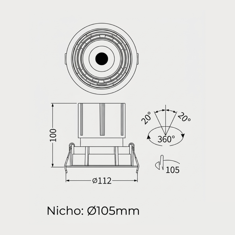 Downlight empotrable 12W 55°, iluminación amplia y potente ideal para espacios generales.